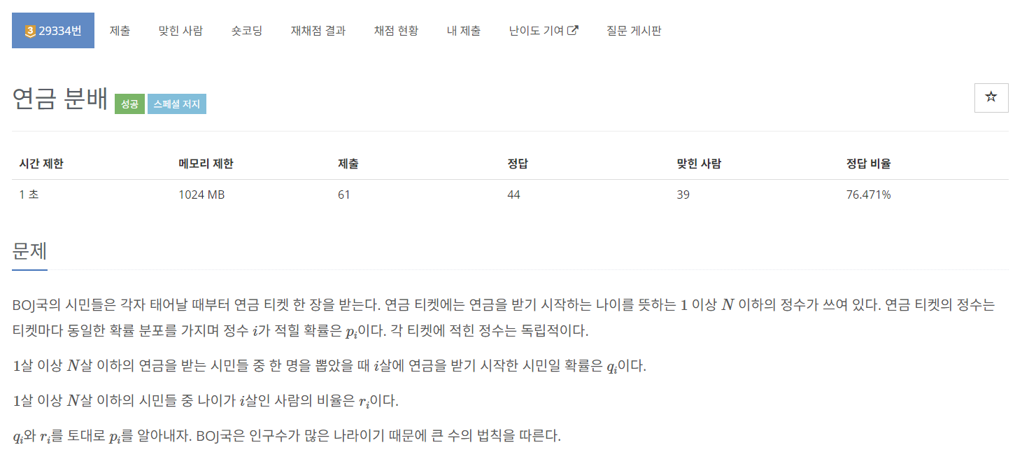월간 향유회라고 매달 대회내는 곳이 있는데 대회에 열정이 있는 사람들이 있다는 것에 감동먹음... 콜포태로 문제를 내봄. 저 문제는 문제를 내야겠다고 생각하고 낸 문제는 아니고 그냥 평소에 생각하던게 수학적으로 풀리길래 백준에 냄. O(n)에 풀리는데 O(n^3) 가우스 소거법 하려는 사람들 낚으려고 n범위 500으로 냄. 실행시간 보니까 좀 낚이신 듯ㅋㅋ