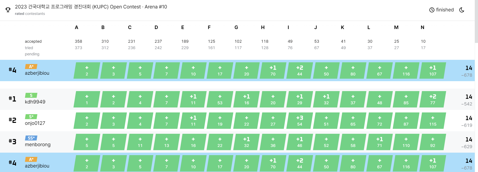 처음으로 아레나를 돌았다. 가운데 보면 H번 문제에서 말렸는데, 지문을 잘못 읽었다. 지문 질문했는데 친절하게 답변해줘서 너무 고마웠다... 암튼 올솔! Mexchange 문제가 재미있었다. 양손정렬, 우정은 bfs처럼 사랑은 dfs처럼은 좋은 교육적인 문제이다.