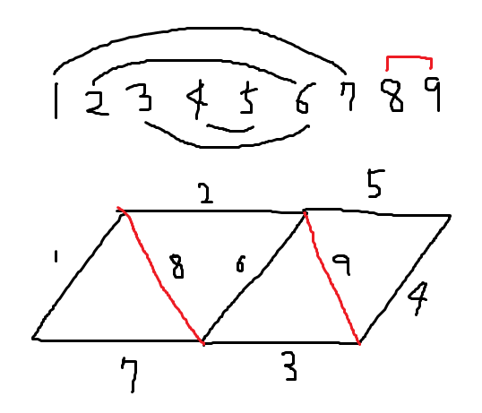 처음에 $l=1, r=2N-k-1$로 하자. $l+r$과 합이 같은 쌍을 만들기 위해서는 $l=l+1, r=r-1$을 해주면 된다. 한 변이 겹치고 합이 $1$ 큰 쌍을 만들기 위해서는 $l=l+1, r=r$을 해주면 된다. 다음은 $n=8$에 대한 예시이다.