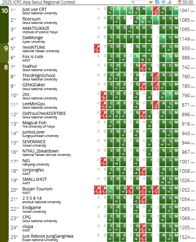스코어보드에는 프리즈 이후 제출이 많았다. solved.ac 디스코더 서버에서는 누가 오렌지 3명있는 팀들이 다들 9솔브를 했을 것 같다고 말했다. 온몸비틀기 해서 겨우 버저비터로 9솔브를 했는데 좀 슬펐다. H번에 제출을 많이 한 것과 초반에 잘한 것이 합쳐져서 9솔 중반 정도의 순위에 안착하지 않을까 싶었다. 기나긴 후원사 세션을 마치고 대회장에서 스코어보드를 까는데...